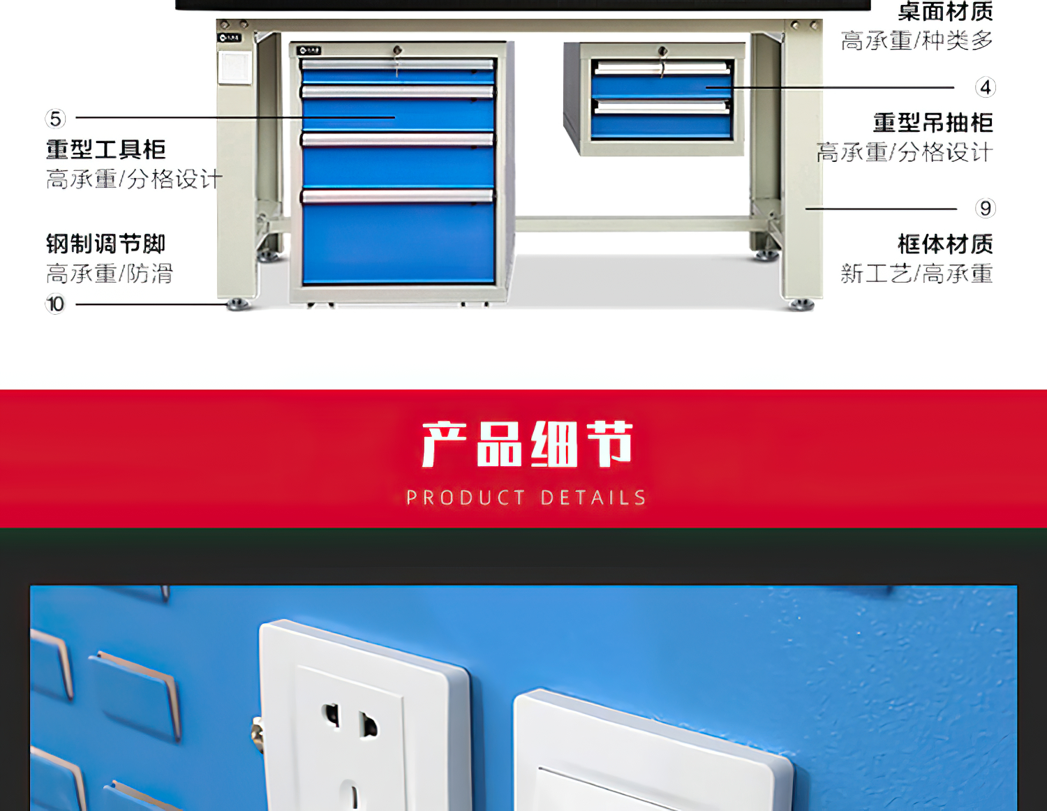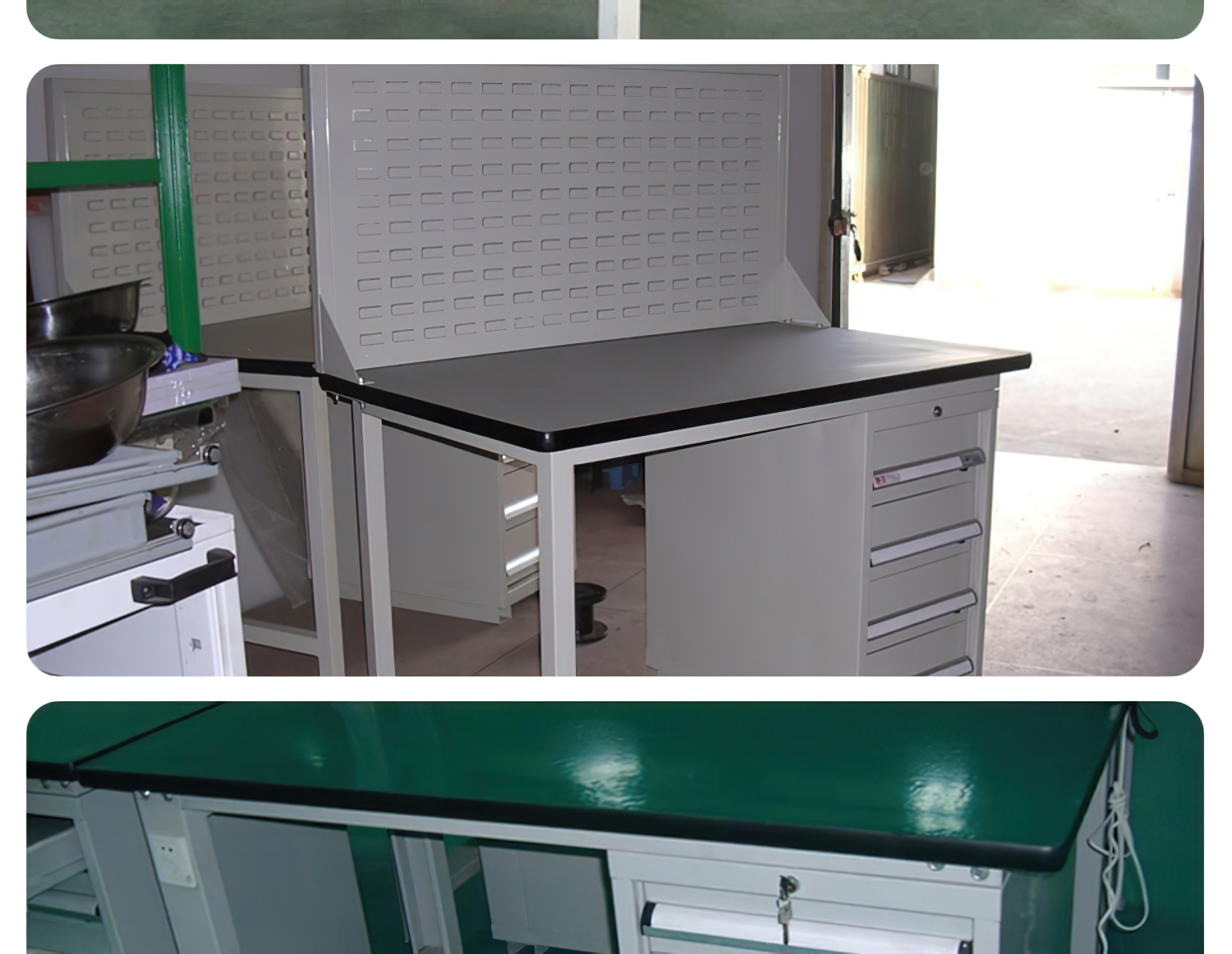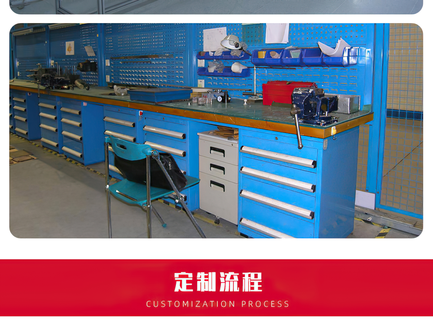 工作臺采用優質冷扎板精工制作而成,堅固的工作桌框架,牢固平穩,可使工作桌承重1000kg;多種工作桌面選擇,可配合不工使用的要求;工具吊柜(箱),側柜(箱),外形美觀;層板,抽屜質量上乘,承重大,抽屜內可根據需要任意分隔;節約空間,適用性強。
